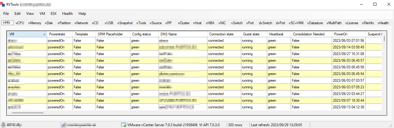 Una de las principales fortalezas de RVTools es su capacidad para proporcionar información detallada sobre las máquinas virtuales. Puede mostrar detalles como el nombre de la VM, estado de energía, si es una plantilla, estado de configuración, nombre DNS, estado de conexión, estado del sistema operativo invitado, estado de latido, fecha y hora de encendido y suspensión, fecha y hora de creación, versión de cambio, número de CPU, sensibilidad a la latencia, cantidad de memoria, número de tarjetas de red, número de discos virtuales, capacidad total de disco, etc….