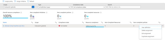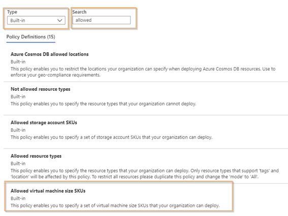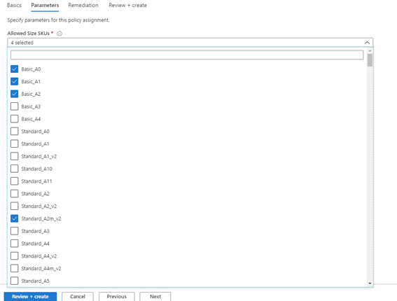 En este caso, en nuestra suscripción, voy a restringir que solo se pueden crear maquina virtual en tamaños concretos