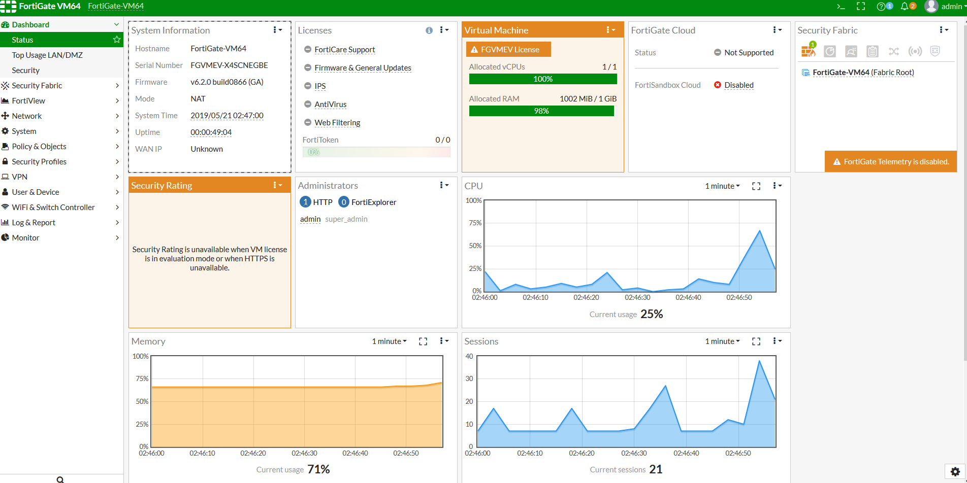 Una vez reiniciado vamos la web de configuración y para ello nos metemos en la ip que le hemos asignado al interface de fortigate